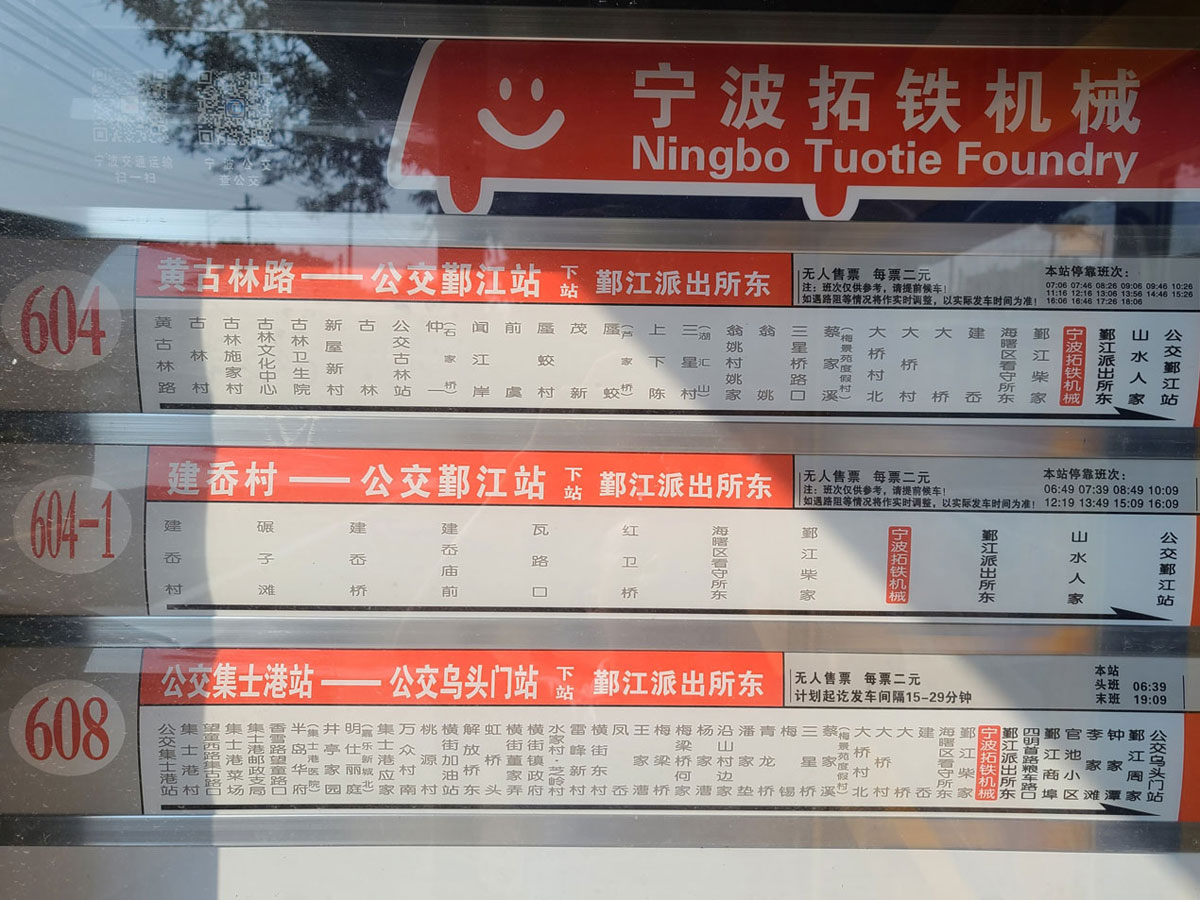 近期,位于寧波市海曙區(qū)鄞江鎮(zhèn)大橋村的“拓鐵機(jī)械”公交車站投入運(yùn)營(yíng),正式并入3條公交線路:604路、604-1路、608路。這將進(jìn)一步為寧波拓鐵機(jī)械有限公司廣大員工及家屬們的日常出行提供便利。